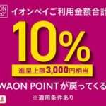 AEON Payのスマホ決済(コード決済・WAONタッチ)を利用すると10%還元キャンペーンです。