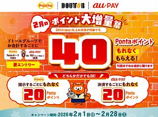 ドトールグループ対象店舗で、Pontaカード提示で20Pontaポイント+au PAY(コード支払い)決済で20Pontaポイントの合計40Pontaポイントを1回の会計でプレゼントしてもらえます。(どちらか一方でもOK)