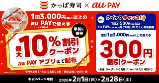 期間中、かっぱ寿司の対象店舗にて、1回2,500円(税込)以上、au PAY(コード支払い)を利用すると、抽選で「翌月1回3,000円(税込)以上で使える300円割引のクーポン」をプレゼントしてもらえます。(獲得クーポン利用可能期間:2026年3月1日~3月31日)