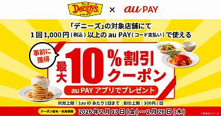 「デニーズ」の対象店舗にて1回1,000円(税込)以上のau PAY(コード支払い)で使える最大10%割引クーポンをau PAY アプリにて配布中です。