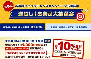 「F&LCグループ(スシロー、回転寿司みさき、京樽、杉玉)」の対象店舗にて、1回1,000円(税込)以上、au PAY(コード支払い)を利用すると、抽選で4ブランドいずれかで使える最大10%割引のクーポンがその場で当たるチャンスもあります。(獲得クーポン利用可能期間:2026年2月14日~3月31日)