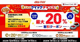 auペイで、最大20%割引クーポンが当たる抽選キャンペーンですよ~