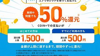 エアウォレット(AirWALLET)・COIN+で50%還元キャンペーン実施です。 新規なら最...