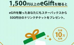 スターバックスの店舗で使えるeGiftを贈る(1500円以上)と、自分にもプレゼント(500円ドリンクチケット)してもらえる...