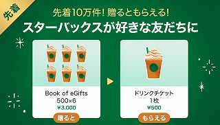 LINEギフトでスターバックスの店舗で使えるチケットスターバックス ドリンクチケット【Book of eGifts 500×6(3,000円)】を贈ると、自分にもプレゼント(500円チケット)してもらえるキャンペーンが実施中です。