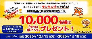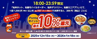 キャンペーン期間内に、松弁ネット・松屋モバイルオーダー・松弁デリバリー・松弁ネットミニアプリで注文し、かつau PAY決済にて18時から23時59分までの間に合計1,000円以上の事前決済した人に、税込200円ごとにPontaポイントを最大10%還元してもらえます。