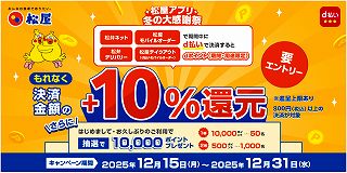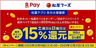キャンペーン期間内に、松弁ネット・松屋モバイルオーダー・松弁デリバリー・松弁ネットミニアプリで注文し、かつ楽天ペイ決済にて800円以上の事前決済をした人に、楽天ポイントが土日は最大15%、平日は最大5%還元してもらえます。