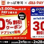 期間中、対象店舗にてau PAY(コード支払い)1回3,000円(税込)以上の利用すると、抽選で最大5万ポイント当たります。