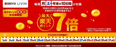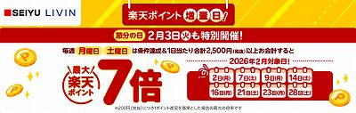 楽天ポイント×西友・リヴィン・サニーで、毎週月曜日・土曜日は条件達成で楽天ポイント最大7倍キャンペーンです。