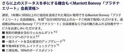 カード加入日から12月31日まで、以降毎年1年間(1月~12月)をプログラム期間とし、期間中500万円以上のカード利用金額達成で、Marriott Bonvoy「プラチナエリート」会員資格を取得
