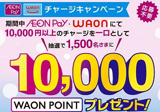 AEON Pay(イオンペイ)または電子マネーWAON(ワオン)にチャージすると、抽選で10000ポイントポイントが当たるキャンペーンです。